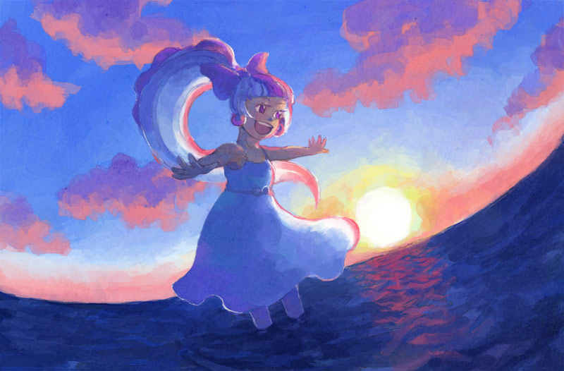 貝殻島の夕陽です。ボリュームたっぷりの髪の毛はまさにパチリス!